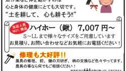 2020年度 プレゼントに本物の鍬(くわ)を 有限会社 永井のくわ チラシ広告のpdfはこちら 創業より100年余り、4代続く「有限会社永井のくわ」です。 野鍛冶の技術を継承し、農作業で使用する鍬(くわ)を中心に農具の製造販売を行っております。 鍬には、土おこし・耕作・雑草を刈る・収穫... 2020.11.08 2020年度