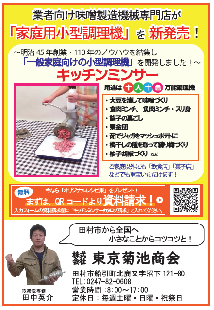 2020年度 一般家庭で使用可能な【キッチンミンサー】の販売開始 株式会社 東京菊池商会 チラシ広告のpdfはこちら 明治43年より110年に渡り食品加工機械を製造販売しており、主に味噌醸造機械の製造販売をしております。皆様が聞いたことのある大手の醸造会社から農産加工所や道の駅内の食品加工機・厨房設備まで... 2020.11.08 2020年度